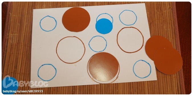 Нарисовала на листе картона большие и маленькие кружочки, обвела фломастером и вырезала из картона соответствующего цвета круги по размеру. Необходимо разместить все кружочки по домикам. Делала такую же еще с квадратами. Думаю эту игру можно усложнить, рисуя не только два размера геометрических фигур, ну и цветов больше можно взять. Степа раскладывал все кружочки по домикам только, когда в каких-то исключительных случаях, но факт - делать это он умеет. А я то думала сложновать ему будет.