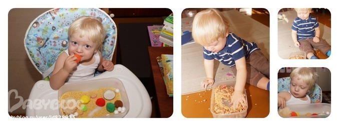 Были у нас сенсорные коробочки: одна с пшеном, другая с горохом и фасолью. Наполнитель был один и тоже, а фигурки я меняла в соответствии с той фигурой, которую изучаем сегодня. Вообще идея с сенсорными коробочками мне очень-очень нравится и сейчас, когда Степка перестал безостановочно все складывать себе в рот стараюсь ежедневно ему предложить какую-нибудь игру с крупой, фасолью и т.д. Пока особо любима - найди спрятанные фигуры, маленькие овощи-фрукты, стеклянные бусинки.