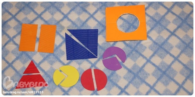 Нарезала я Степе геометрических фигур, состоящих из двух половинок (круги из пенки, а все остальное из гафрированного картона). Для кругов сделала еще как бы контур, так как без него было совсем непонятно, что мама от ребенка хочет. Не сказать что прям все фигуры складывал, но что-то все равно получалось. Еще показала Степе, что квадрат можно составить из двух треугольников или из двух прямоугольников.