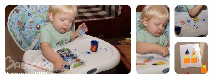 Творили на этой неделе совсем мало. Я налепила геометрических фигурок (вот здесь взяла рецепт http://www.babyblog.ru/community/post/igraem/1700971, а здесь идею http://www.babyblog.ru/community/post/igraem/1701920, опять же у Елены), а Степа их раскрашивал.