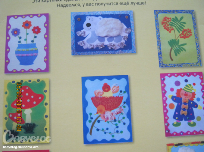 Очень плотные листы картона, сочная полиграфия и предлагается использовать не типичные материалы для работы - фольгу, макароны, перья... Поделки получаются красивые. Их даже жалко убирать))) Мы половину бабушкам нашим раздарили, в том числе и к праздникам.