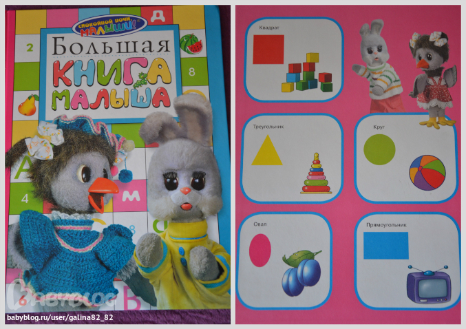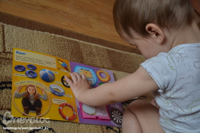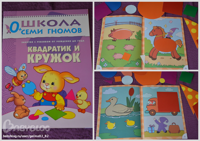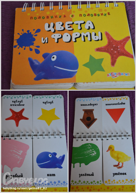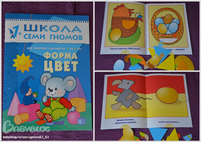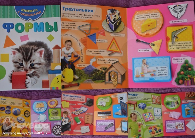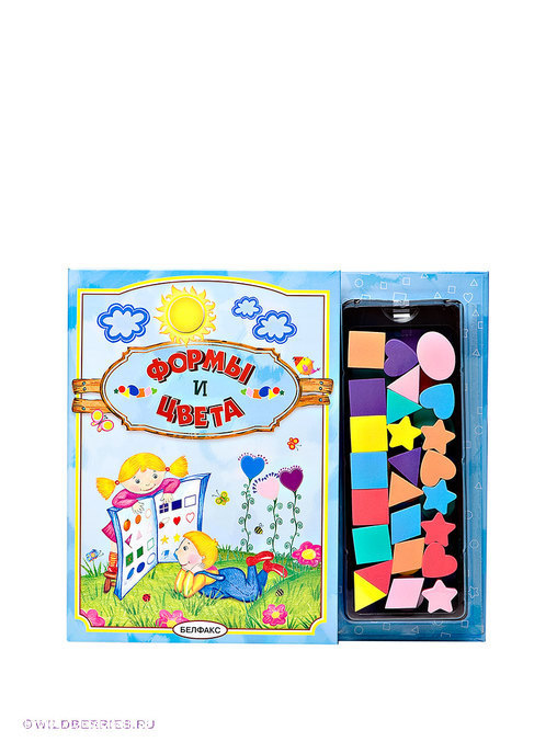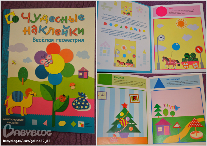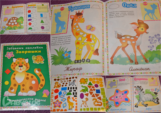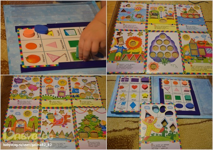 Внутри содержатся карточки с прорезями для фигур, ярие иллюстрации и стишки