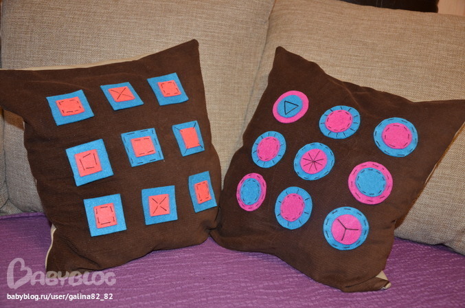 Ну и в завершении всего из остатков "дидактического материала" сшила две геометрические подушечки из кружков и квадратов