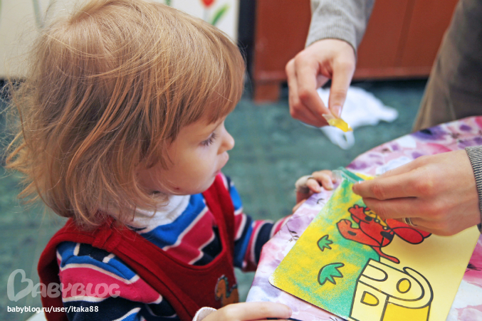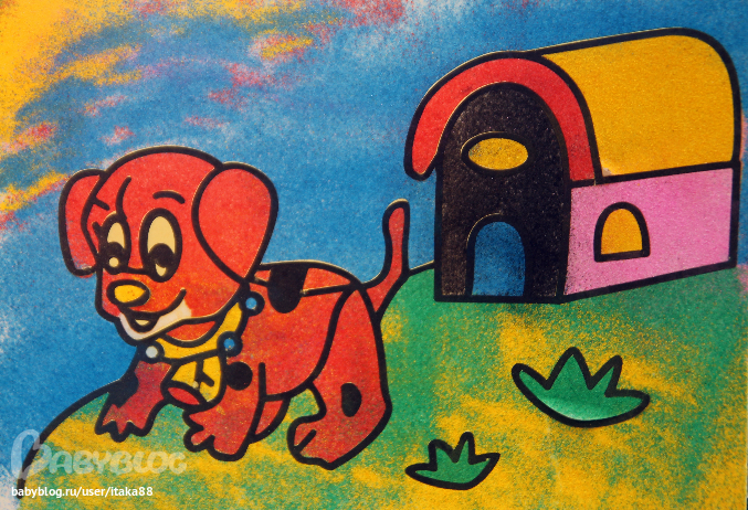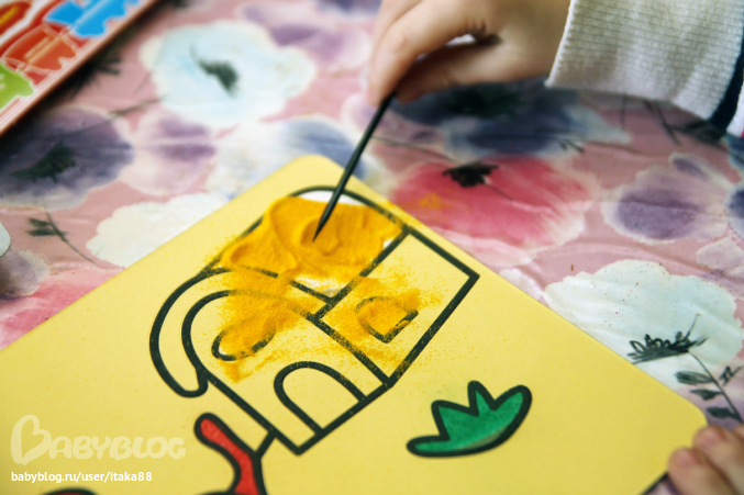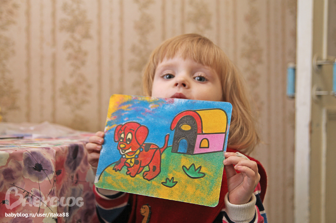 Мы тоже любим такие картины из песка делать. Наверное, самое любимое Катюшино занятие. Я убираю с картины защитную бумагу, а Катюша засыпает все песочком. Потом помогаю ей его распределить равномерно.