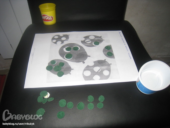 Начали мы с украшения божьм коровкам. Соня наклеивала кружки на черно-белых божьих коровок.