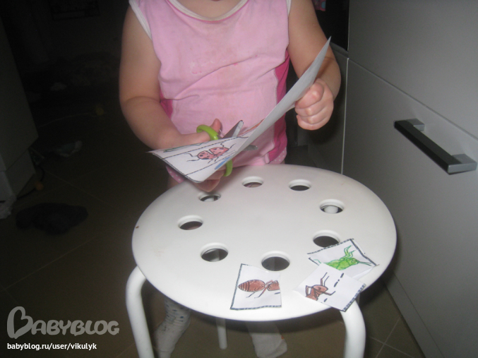 Решили мы разрезать наших насекомых на карточки (ну я так планировала), а Соня придумала еще и располовинить самих насекомых.