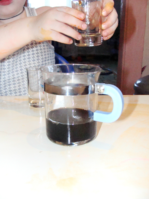 В третий стакан выливаем крахмальную воду, потом йодную, и вуаля.... Саша сказал, что черный цвет получился))) На самом деле, темный фиолетоый.