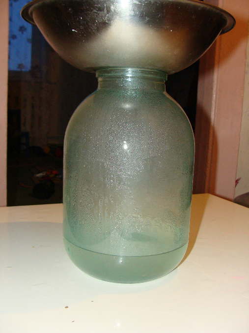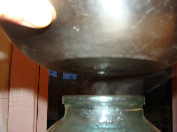 Пар поднялся, на холодной миске охладился и закапал вниз. Банка запотела изнутри и было не видно, пришлось поднимать миску и смотреть на капельки.