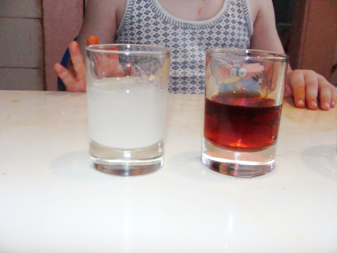 Делаем в стаканах две смеси. Крахмал+вода и йод+вода.(У Саньки оранжевые пальцы, это мы только что делали отпечатки разными предметами)))) )