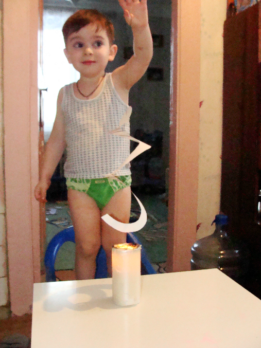 А это спираль на нитке. Сначала показала я , что над столом не крутится, над теплой свечкой крутится. Объяснила, что поток теплого воздуха приводит ее в движение.