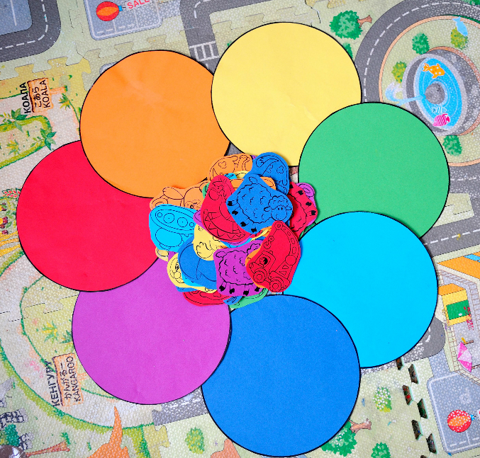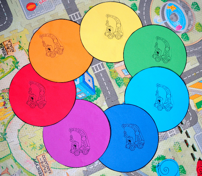 В интернете выбрала 12 картинок из разукрашек , скомпоновала в Word их на листе А4 и распечатала на цветной бумаге! далее обклеила обратную сторону скотчем и вырезала ( сейчас я бы еще и лицевую сторону прозрачным скотчем обклеила, а то пачкаются )