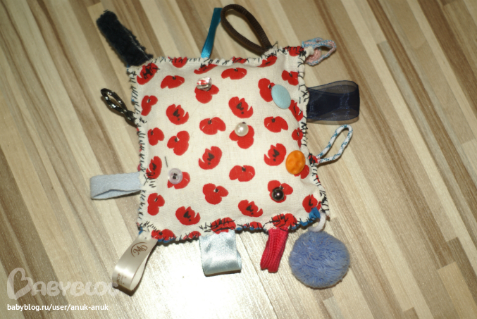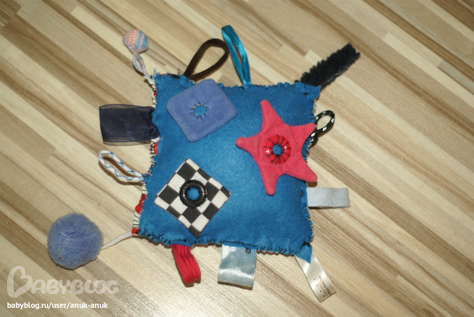Самодельные игрушкиКак только у Яны появился интерес ко всяким ярлычкам, я сразу решила, что нужна такая подушка, я ее как-то в интернете видела. Долго собиралась начать, все время не находила. И вот три дня работы и все готово. Швейной машинки у меня по-прежнему нет поэтому все в ручную, на скорую руку и не очень аккуратно. Но Яна оценила и долго разглядывала бусинки, ленточки и пуговки.