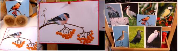 На шаблон ветка рябины (рисовала сама) прилепили ягодки, а потом приклеели снегиря на ветку. Получилась вот такая симпатичная аппликация с разной техникой.Рядом для наглядности фото снегиря. Я вообще люблю карточки в виде фотографий- по этому часто просто подбираю нужные картинки и распечатываю в фотосалоне. А справа наше пособие- картинки с птицами, тоже очень хорошие карточки