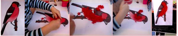 Распечатала шаблон снегиря, нарезала нитки красные шерстяные, и сделали пушистую грудку птичке.