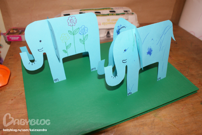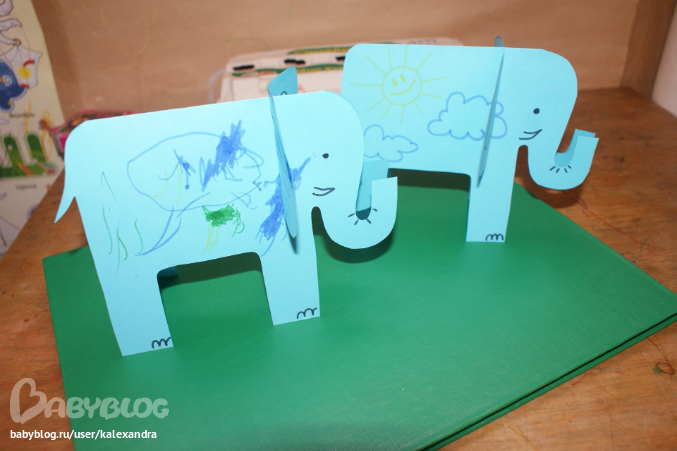 Разукрашивали слоников. На правом слонике на боку ребенок бабочку нарисовал))