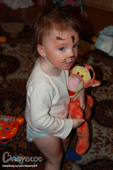 Ножку София разукрашивала сама, пока я пыталась сделать из неё тигрёнка! Крутилась, как юла, но вроде, получилось похоже!)