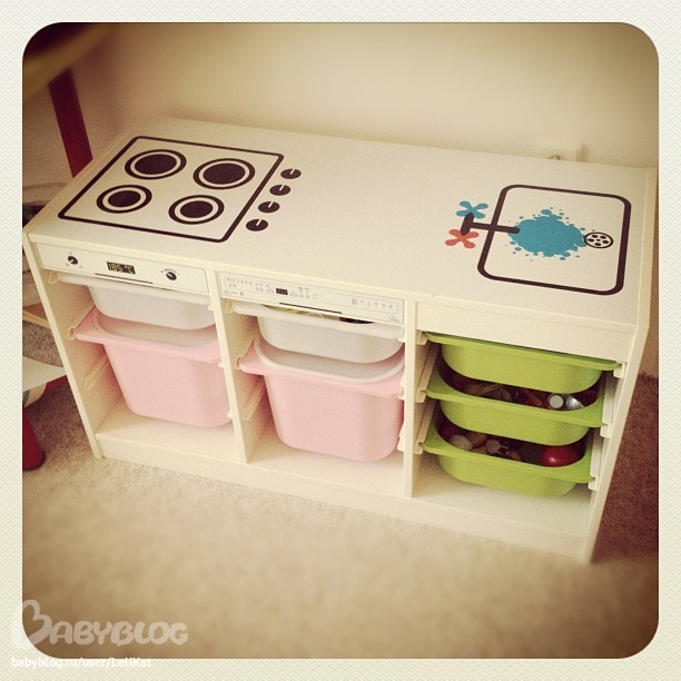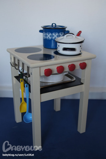 а вот и десткая кухня из ТАБУРЕТКИ! и здесь фантазии нет предела: можно и фартучек повесить, изобразив на нем маркерами духовку, и сверху надстройку сделать: