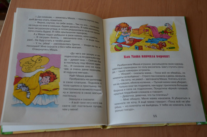 Меня немного смутила история о неряшливой девочке, которую в рабство унесла ворона, а за непослушание тюкала ее клювом в макушку.... На самом деле сказка о том, что девочки должны помогать маме и убирать в своей крмнате. Но так случилось, что сии истории первым на ночь прочитал дочери папа. А он вывел свою мораль: нельзя разговаривать с чужими на улице...