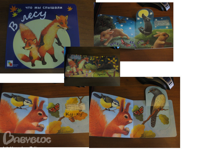 "Что мы слышали в лесу". На каждом развороте лесные жители, стишок, который заканчивается звуком (например: От куста к кусту шагает, А куда идти не знает. Страшно ей одной в лесу И зовет зрузей... Ау-у!), окошко, в котором сидит персонаж стишка. 130р.