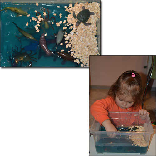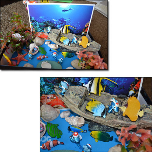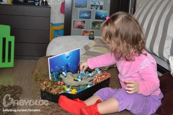Еще мы сделали для игры свое море. На дно крышки от коробки наклеила синюю цветную бумагу, с помощью пластилина прикрепила искусственные водоросли, поставила затонувший кораблик (для аквариума), положили разные ракушки и камни. И у нас получилось самое настоящее морское дно. А жили у нас там рыбки и дельфины. Мы долго играли с этой коробочкой, около недели точно.