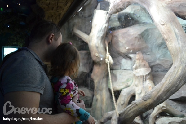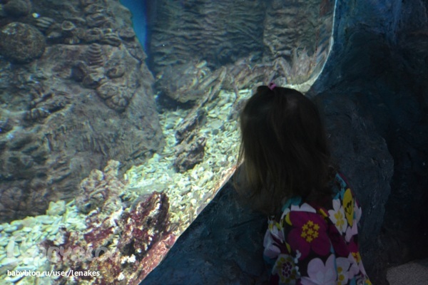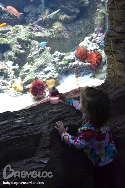 Как я уже писала. В воскресенье мы решили наглядно закрепить тему и отправились на другой конец Москвы в океанариум. Настюха в этом году уже все это видела, правда тогда мы гостили в Воронеже у бабушки и дедушки (там, кстати, океанариум мне даже больше понравился). Но в этот раз мы уже более осознанно подошли к этому делу. Настя многих узнала. Подбежала к аквариуму и кричит: «Мам, еж (морской еж). На еж пить» и сует ему свой поильник. Видно мало ежу, было, воды вокруг.