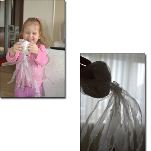 Сделали медузу из пакета. Своими щупальцами медуза щекотала Настену, а та бегала от нее по всей квартире.