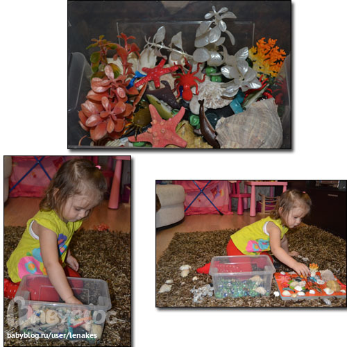 В первую коробочку я положила маленьких морских животных из этого набора, разные ракушки, камни, искусственные водоросли.