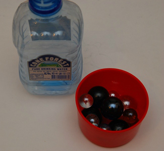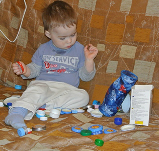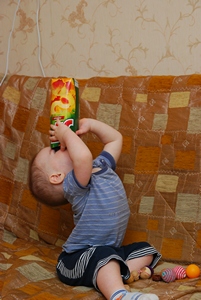 Пособирали шарики - орехи грецкие, каштаны, бусины можжевеловые крупные, шарики д.пинпонга...пакет с соком малыш давно глаз положил))), подготовки на одну минуту, Мише понравилось.