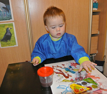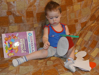Апликации еще есть, в основном машины (мотоциклы) из журналов вырезаю, Миша сначала их покатает со звуком, а потом клеим))) Клей мажу мишиной рукой,т.к. пока не получается, под углом держит, переворачивает и наклеивает сам.