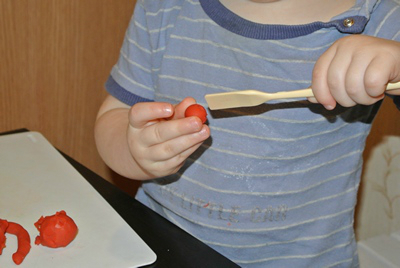 Пробуем колбаску катать их шарика, процесс понятен, только надо подольше катать, а Мише результат хочется сразу увидеть.