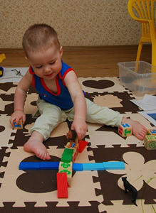Очень хочу, чтобы Миша начал строить из кубиков, ему даже башенку не охото строить, ну максимум из 5-ти кубиков построить, если я подавать буду и просить поставить...только бы раскидать, хотя сам кубики то и дело достает. Вот заинтересовываю, строим дорожки топаем зверями, строим домики для зверей вот на фотке мост через реку строили.