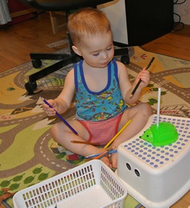 А это занятие не вдохновило, карандашей не точенных нет у нас, а этими он больше хочет почеркать где-нибудь, чем вставлять в ежика, надо будет с трубочками попробовать. Кстати, вставляет исключительно острием вниз.
