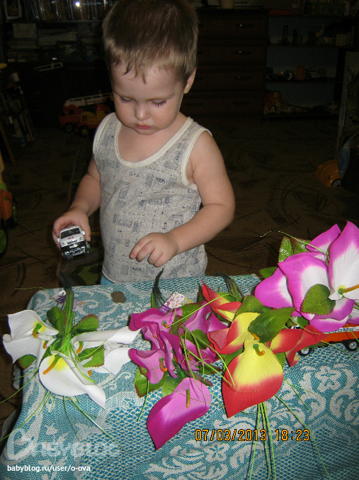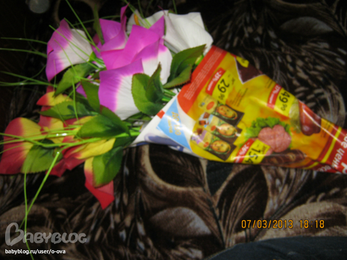 Заодно я ему цветы упаковывала...в газетную бумагу, правда, не нашла подходящей упаковки вовремя. Ну зато ребенок знает, что цветы надо упаковывать в магазине)