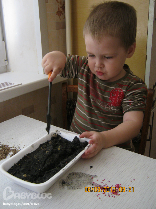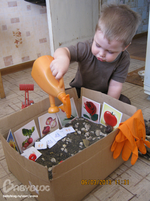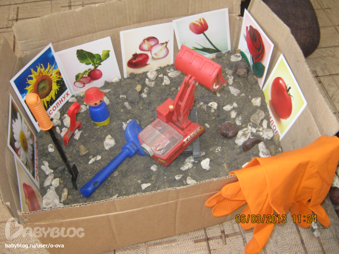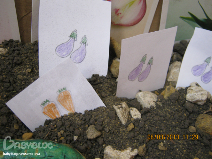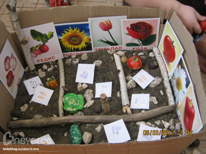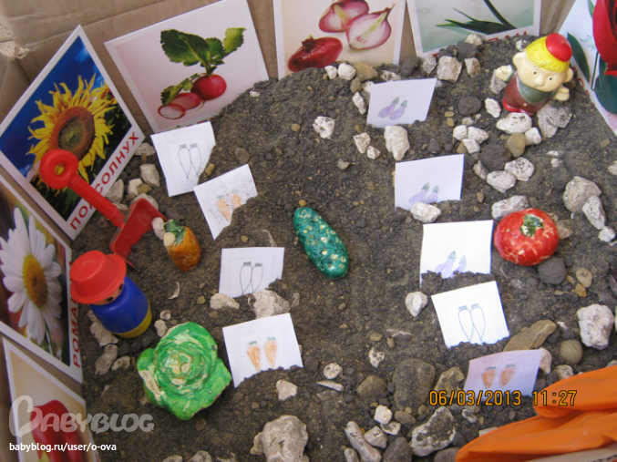 В основе обычная земля...Взяла карточки с овощами и цветами и мы устроили огород. Как положенно - сначала комбайном вскопали, потом граблями все обработали, ну и сажали)))) А потом там еще чучуло даже поставили, чтобы вороны не клевали побеги, а на каждой грядке сделали обозначение - что у нас тут растет.