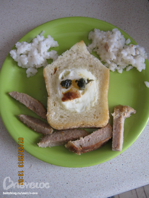 Это кусочек хлеба - скворчник. Внутри птица из яица. Облака из риса. Ветка из котлеты.