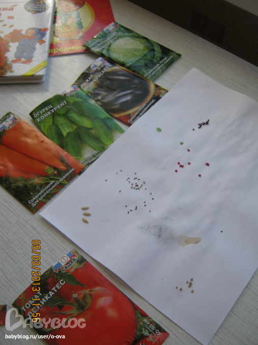 Я купила несколько пачек семян. Показала Кирюхе, что они все разные, рассказала откуда берутся семена. Показала, например, огурчное семечко, а потом разрезала огурец и показала эти семена внутри огурца.