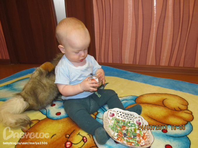 а ещё у нас новая забава..он любит играть в конфетки))) сегодня научились перелаживать их в баночку))