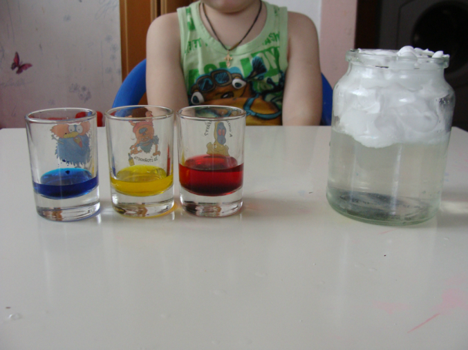 Ну и напоследок. В банке вода и пена для бритья. В стаканах подкрашеная вода.