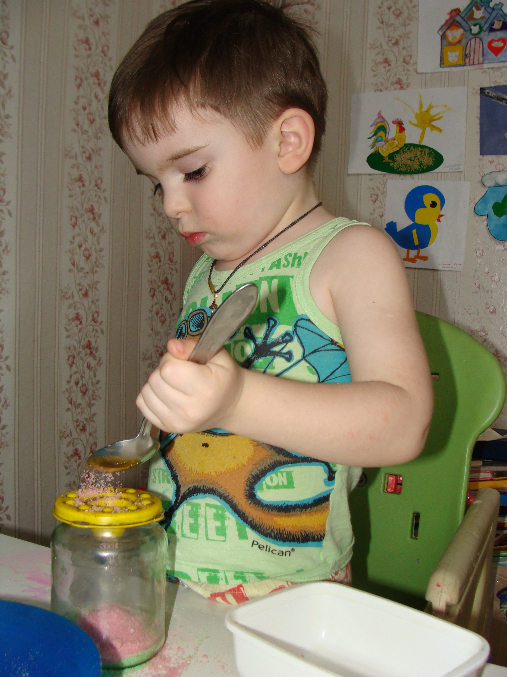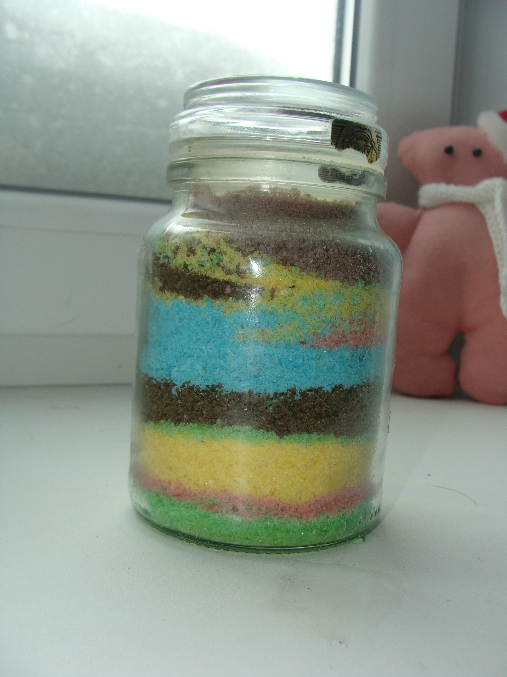 На этом мы не остановились))). Накрасили соль, и насыпали в банку через воронку (у нас крышка от банки-непроливайки). Чем не Монтессори?)))