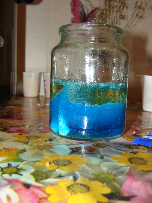 А вот, ради чего, собственно покупались красители. Нужно: краситель, вода, раст. масло, алкозельцер. В банку наливаем воду, покрасили ее для красоты и наглядности, в общем-то. Сверху наливаем раст. масло, побольше)