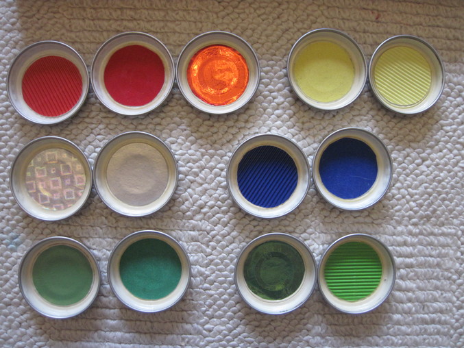 Крышечки от детских пюрешек отлично примагничиваются! Бумага четырёх сортов: гофрированный картон ("ребристая"), бархатная бумага, перламутровый кратон и гологафическая бумага ("с блёстками". Старалась подобрать кружки близкие по цвету, но разные по фактуре. Карточки сделала похожими на палитры. Дополнительно украшать не стала, чтобы не отвлекать внимание.