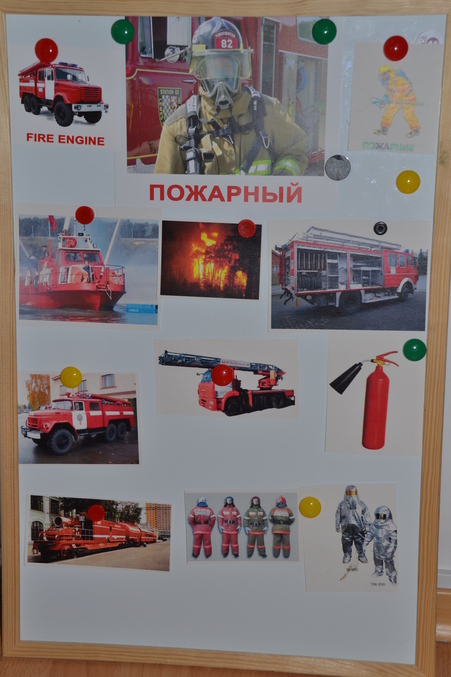 Как я уже писала раньше, начинаю знакомить Матвея с разными профессиями. Первым был пожарный. Сделала небольшую тематическую доску, с картинками пожарой спец техники (пожарная машина, поезд, катер, вышка, огнетушитель), спецодежды, ну и самого пожара.