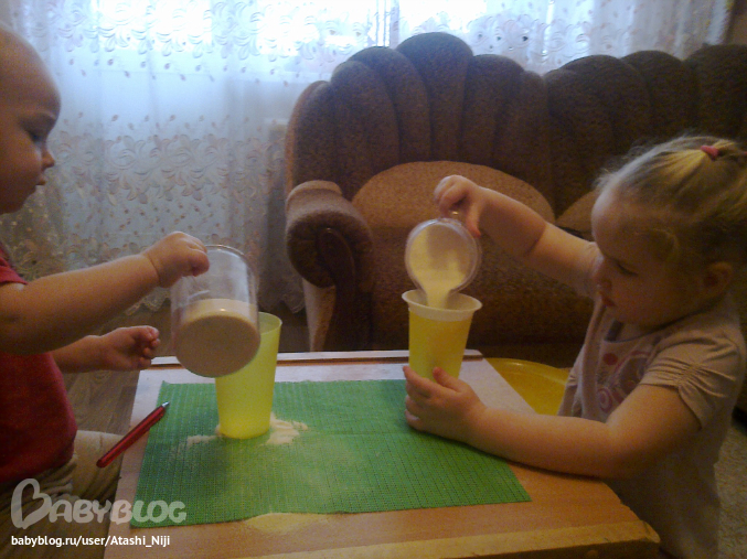 Справились на отлично, с Макаром учились регулировать наклон кувшина, чтобы манка не просыпалась мимо стакана.Крупа манная, радость у детей небывалая, Макар трогал ее снова и снова и никак не мог натрогаться :) Видимо уж очень она ему понравилась и ощущения, которые остаются на пальчиках тоже!