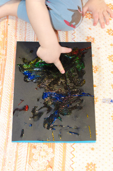 клеем с блестками рисовали северное сияние под песню Министрели - Северное сияние (очень клевая песня - люблю ее уже давно)))