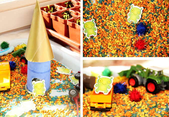 А для маленьких инопланетян из этого мы сделали ракету поменьше и отправили на другие планеты. Сначала планет было две: оранжево-красная и сине-зеленая. И инопланетяне полетали туда-сюда какое-то время, перевозя космические грузы. Но Андрей устроил великое смешение планет и превратил их в одну яркую разноцветную, добавив туда уже вполне земной техники)))