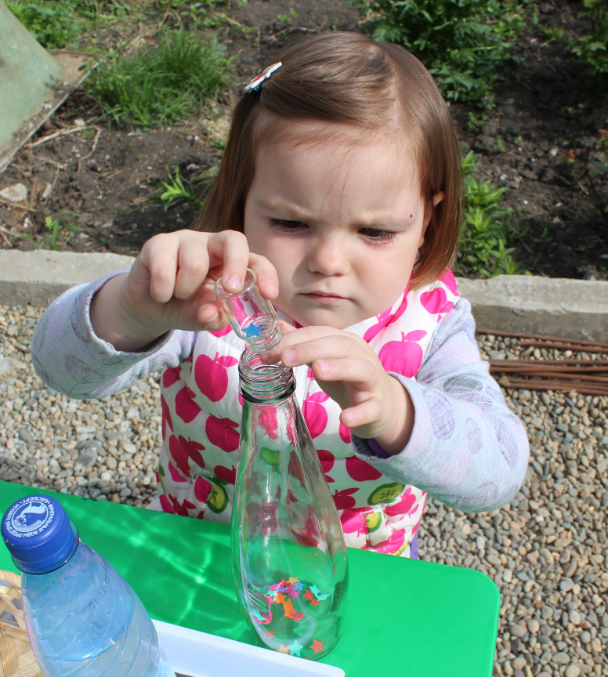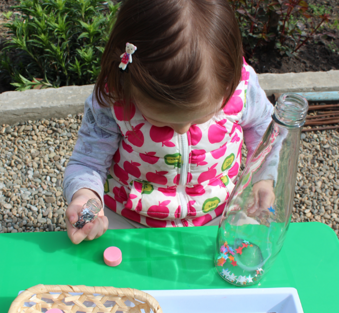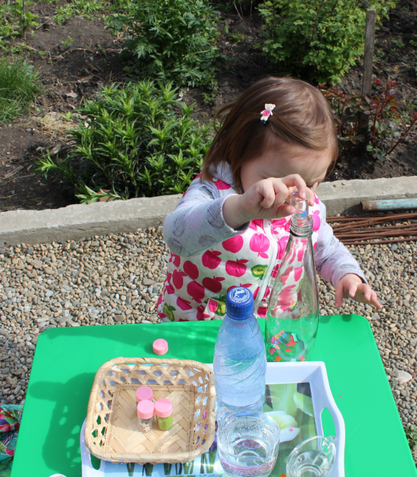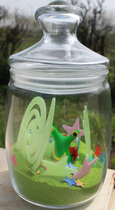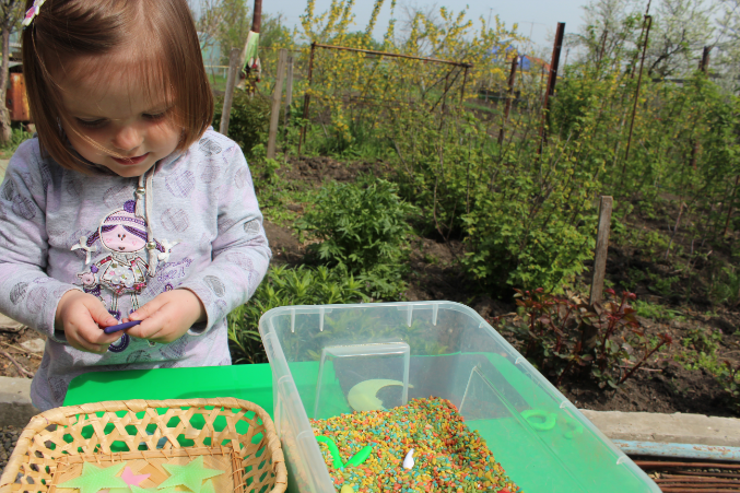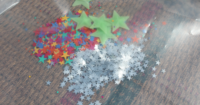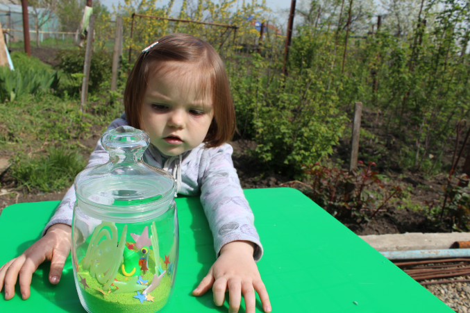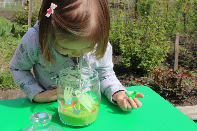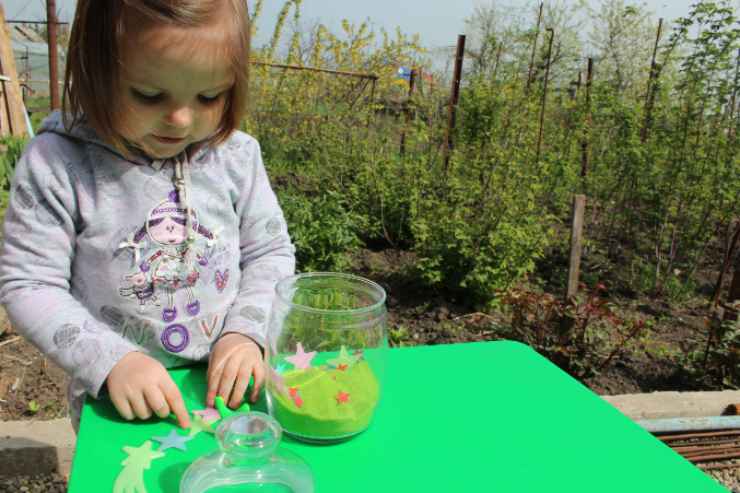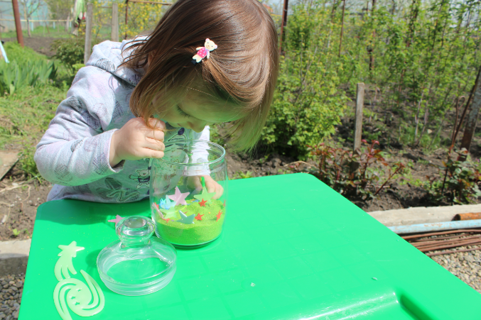 Итак, нужно было раскрутить маленькие баночки с песочком, двумя видами звездочек и жидким красителем.