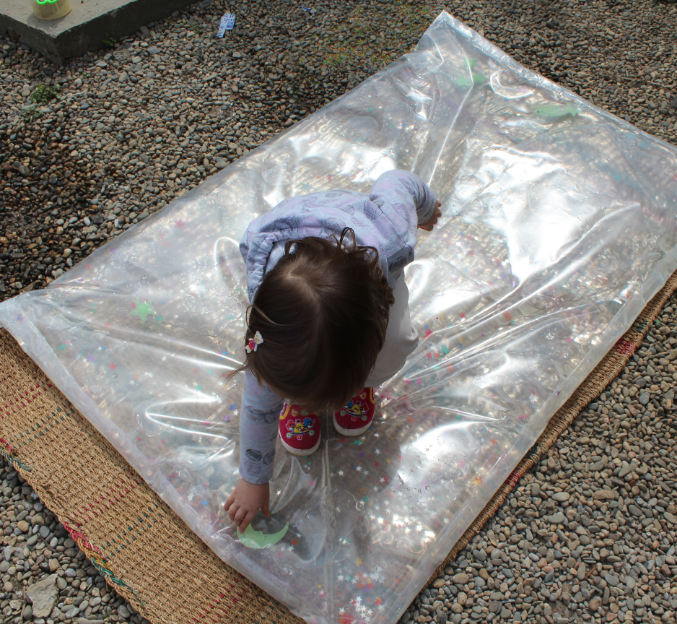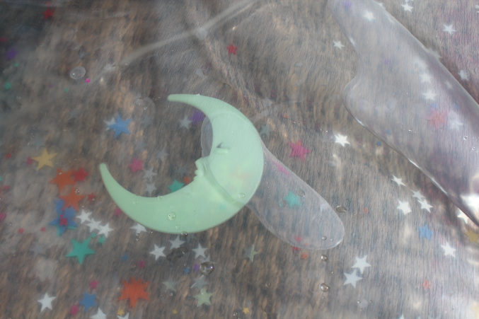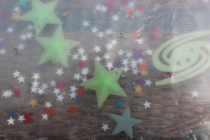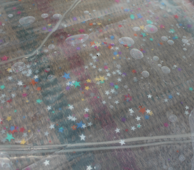 Это большой пакет, сделанный из пленки, в него мы поместили различные звездочки и другие фигурки, заполнили водой и получился такой волшебный космос ))