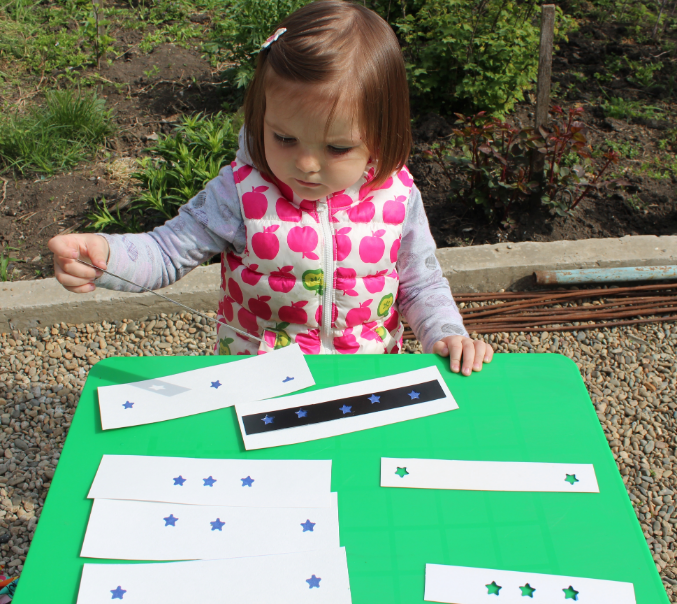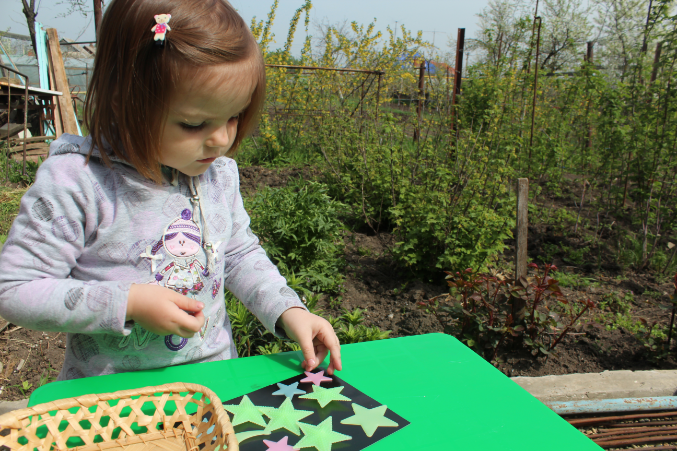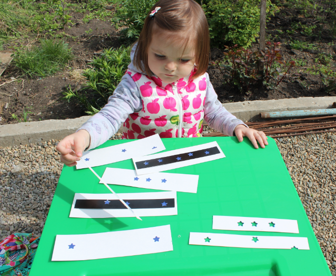 Следующее задание! Слева от вас карточки со звездочками, а справа карточки-трафаретики - нужно было отыскать пару карточка-трафарет и проверить правильность этой пары - просто приложить трафарет и если рисунок сошелся - все верно)