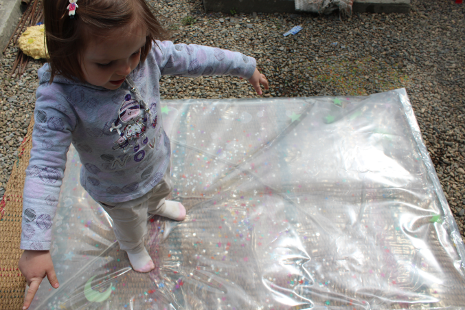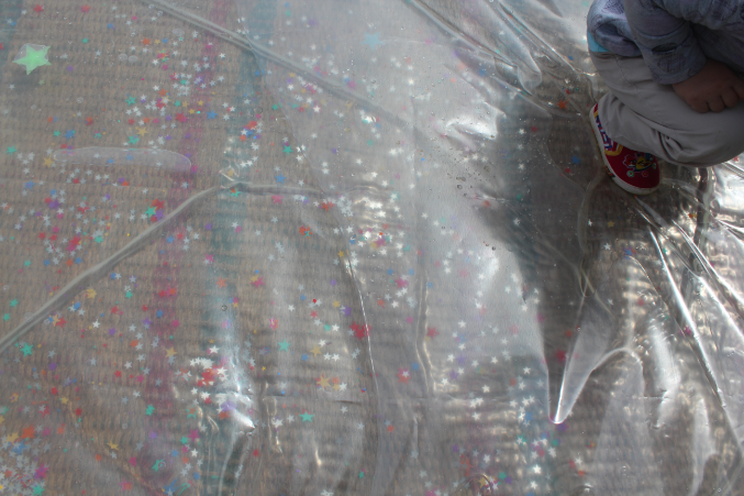Для этого батута я купила 2 метра пленки, сложила ее паполам и тщательно проклеила скотчем края (отчень тщательно),остави лишь небольшую дырочку, чтобы поместить туда звездчки и налить воду.