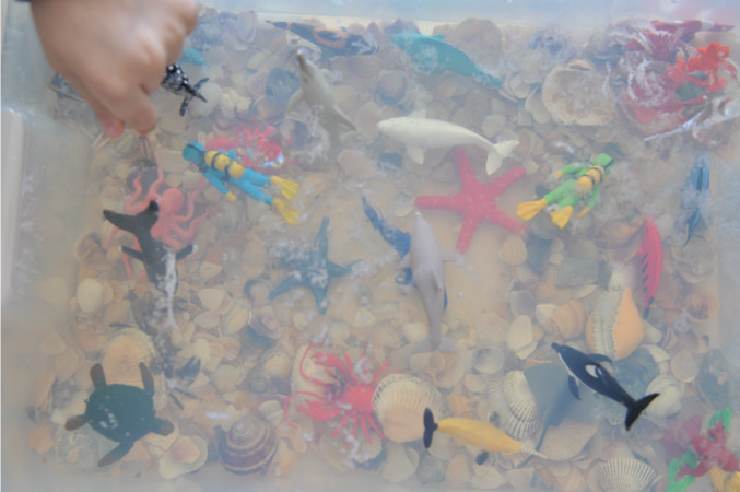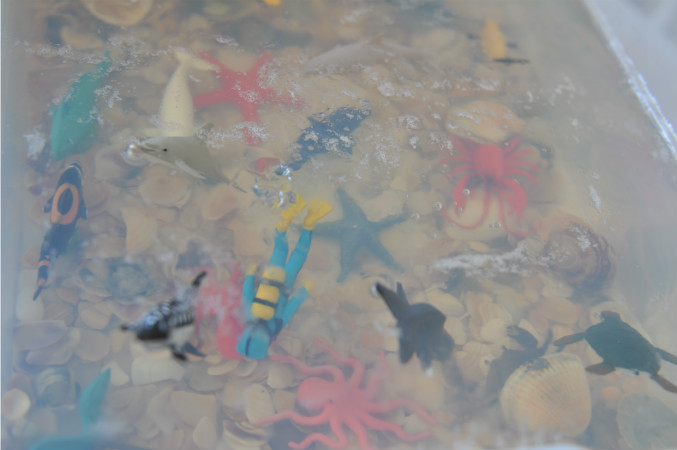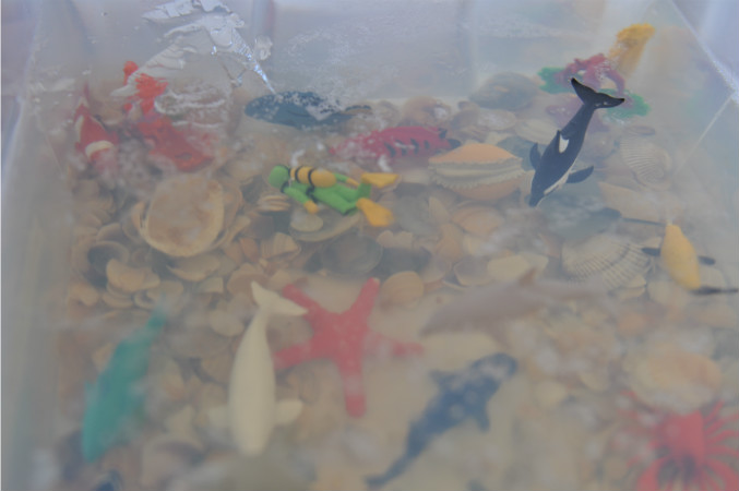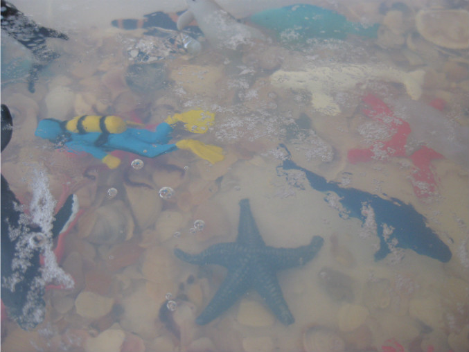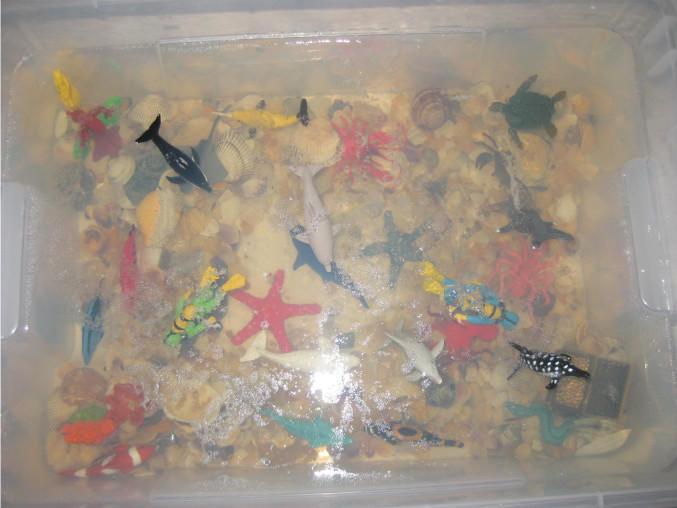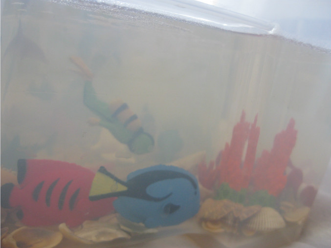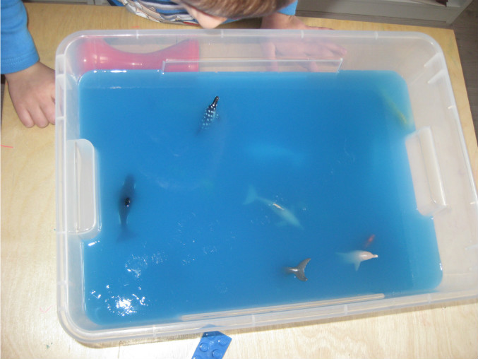 Итак море. Я делала два моря из желатина, заливала послойно, одно море было прозрачное, второе синее. На примере первого моря рассказывала кто где живет (в зарослях, толще воды, на дне), кто что ест, кто кого боиться, кто с кем "дружит" и наоборот. На примере синего моря делали открытие "почему море синее", срезали разной толщины слои "Моря" и в конце сделали вывод.